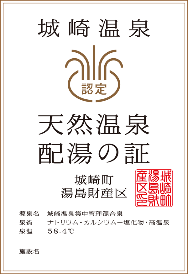 令和5年11月より、城崎温泉では“天然温泉”を利用している施設において 「城崎温泉天然温泉配湯の証」を順次掲示しております。 城崎温泉を観光の際の目安にご利用ください。