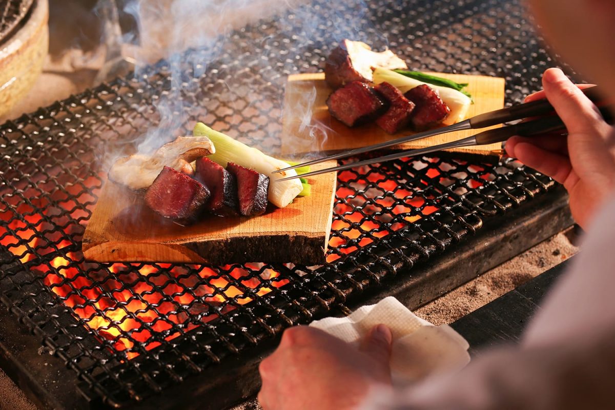 囲炉裏で繊細な火入れをした但馬牛赤身肉の旨味を、旬の焼き野菜の香り高い風味とともに心ゆくまでお楽しみください。