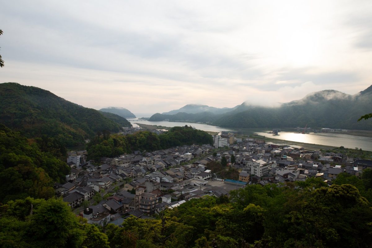 振り返ると城崎温泉街とともに雄大な円山川、日本海まで一望できます。