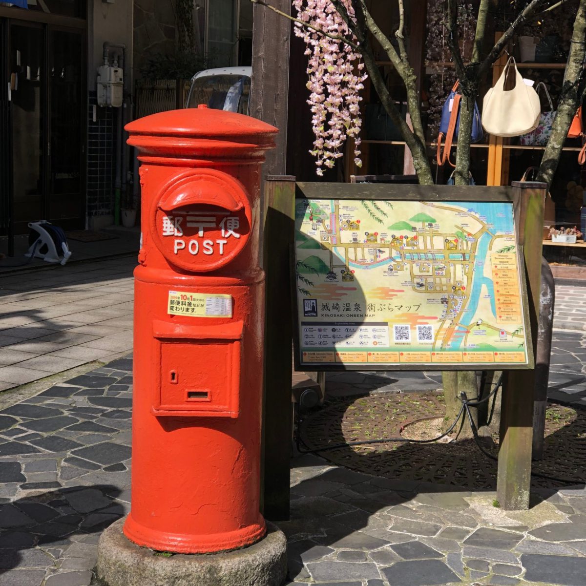 現在全国各地で見かける郵便ポストは、角型と呼ばれる直方体のかたちのものですよね。城崎温泉では、角型ポスト以前の丸型ポストが現役。円筒のかたちをした丸型ポストは、昭和24年(1949年)から普及しはじめ、昭和45年(1970年)には生産も設置も終了しており、今ではなかなか見られない代物です。城崎温泉の街なかで数カ所に存在している丸型ポストを、見て回るのも楽しいのではないでしょうか。