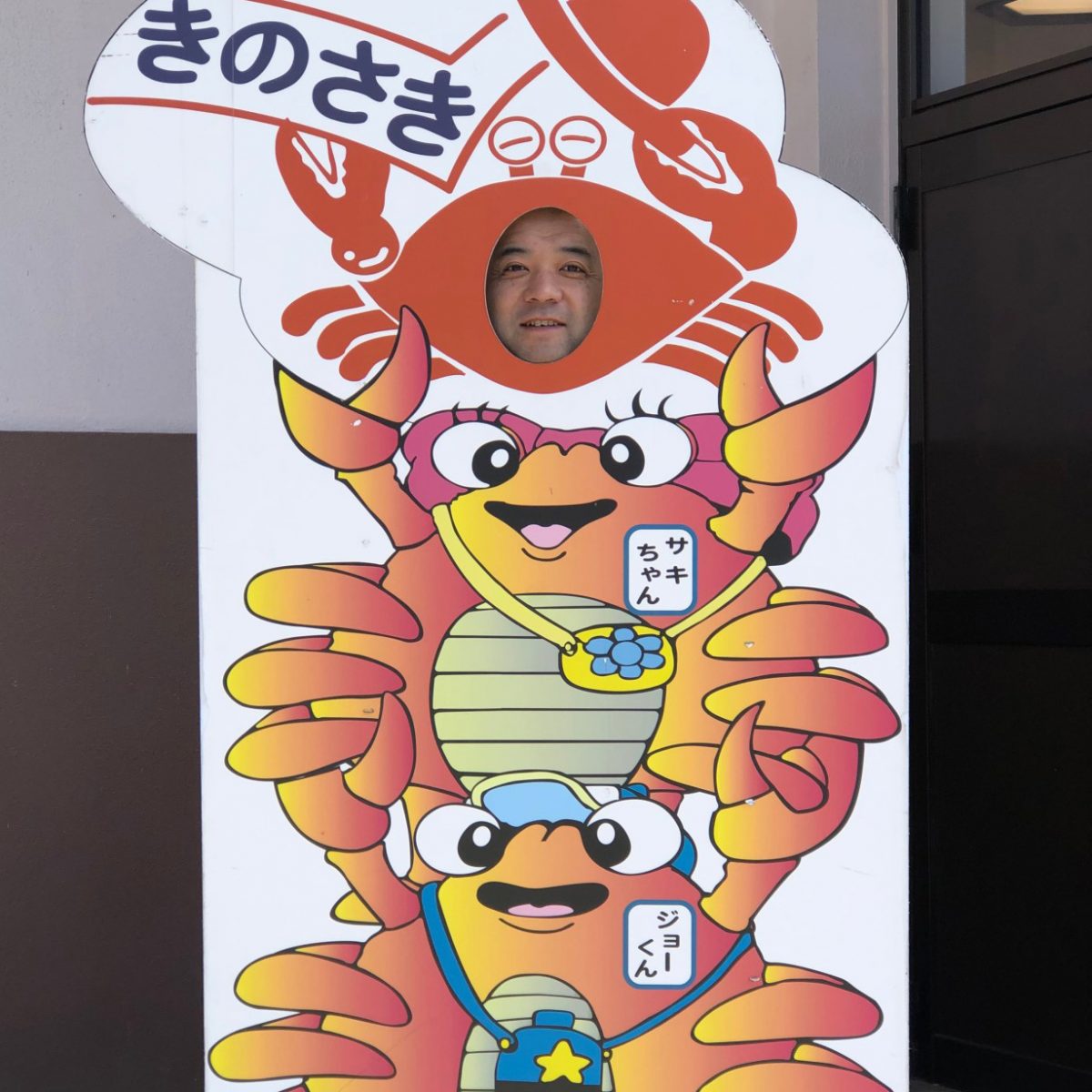 写真は、かにをはじめ新鮮な魚介を扱う「いなば鮮魚」の看板。口を開けてかじってみたり捕まえてみたり・・楽しい写真が撮れますよ。