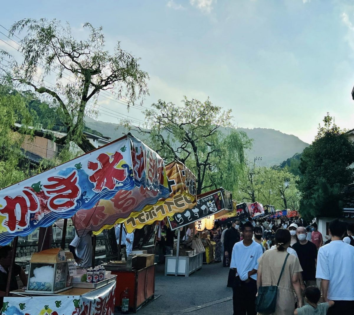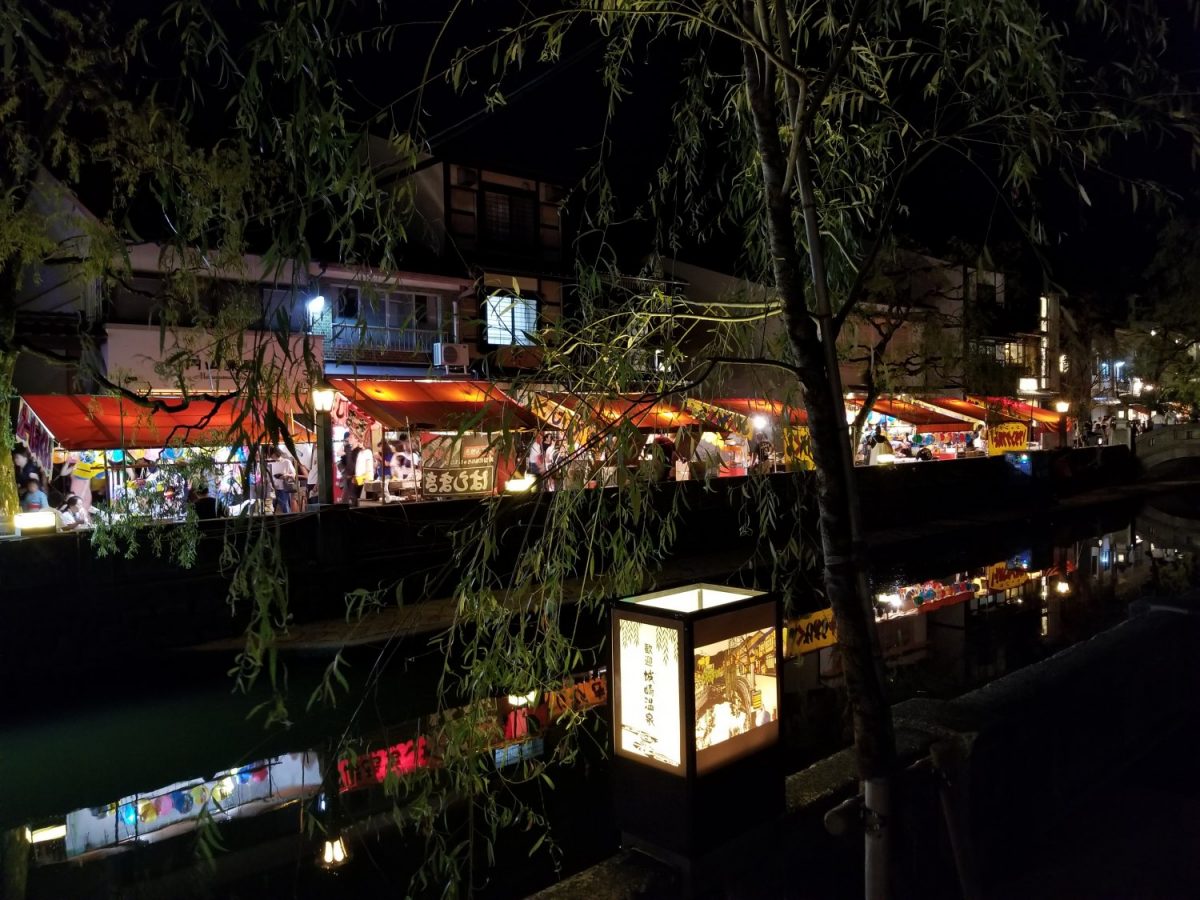 城崎温泉街を流れる大谿川沿いにはヨーヨー釣りや駄菓子くじ、